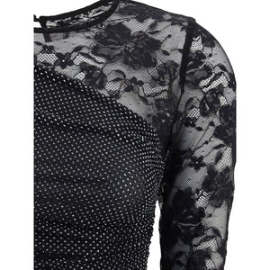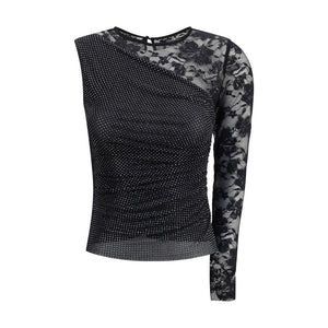 Self-Portrait’s one-shoulder Top is a striking and sophisticated garment that plays on the contrast between delicacy and brilliance. On one side it features a floral lace sleeve, refined and romantic, while on the other side it features a rhinestone-rich detail that adds light and glamour to the design. Perfect for original looks with a strong aesthetic impact.