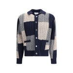 Intarsia wool Cardigan by Thom Browne, made with a fine knit combining ribbing and braiding. The design features a classic collar, front button closure and two welt patch pockets on the front. Ribbed cuffs and hem ensure a comfortable and defined fit. An iconic garment that combines traditional elegance with the brand’s distinctive design.