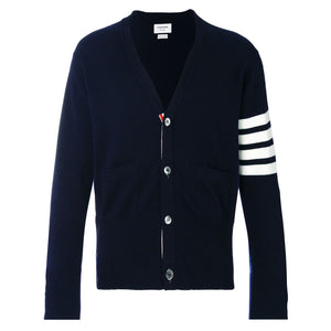Navy blue cashmere 4-Bar Cashmere Cardigan from Thom Browne. 4Bar cashmere cardigan Size and Fit - This piece fits true to size. We recommend you get your regular size. Model is 1,84m / 6ft 1in wearing size 2 (NUM)