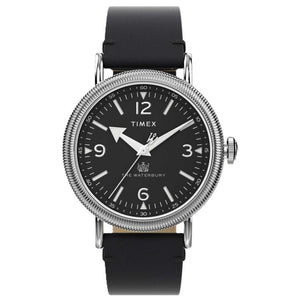 TIMEX MOD. WATERBURY wristwatch with black leather strap and silver casing, showcasing a classic analog dial.