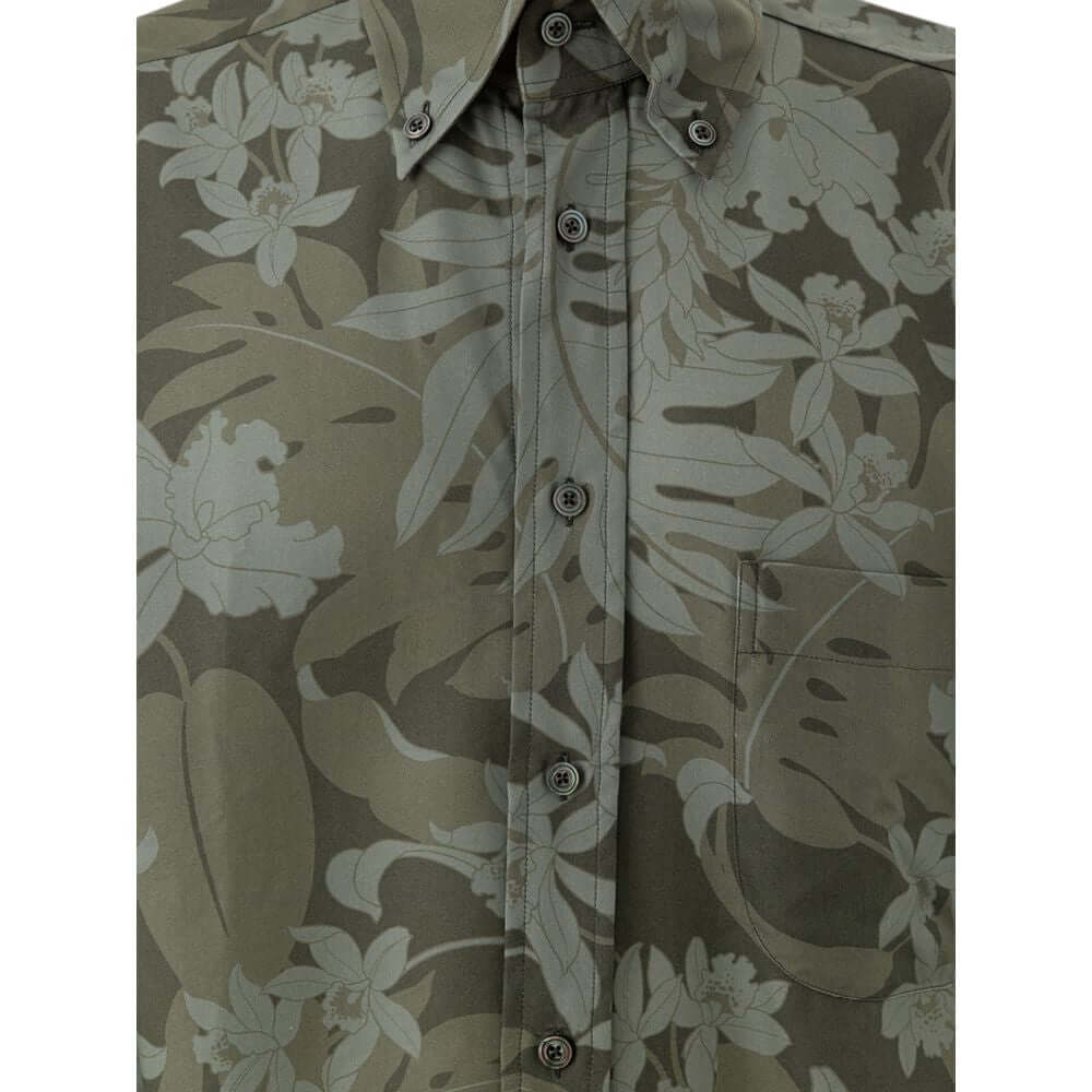 Tom Ford Green Floral Print Shirt. Front button fastening, regular collar, side pocket, slightly rounded at the bottom, regular fit. Allover green floral print.