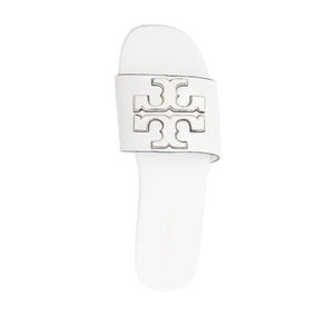 embossed-logo leather slides from TORY BURCH featuring white, calf leather, signature TB monogram patch, open toe, branded leather insole, flat leather sole, rubber outsole and slip-on style. Eleanor leatherflat sandals Size and Fit - Heel 0,6 in / 1,5 cm; Platform 0,4 in / 1 cm
