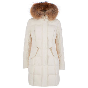Yes Zee long quilted down jacket in softshell fabric, zip and button fastening, two front pockets, fur hood